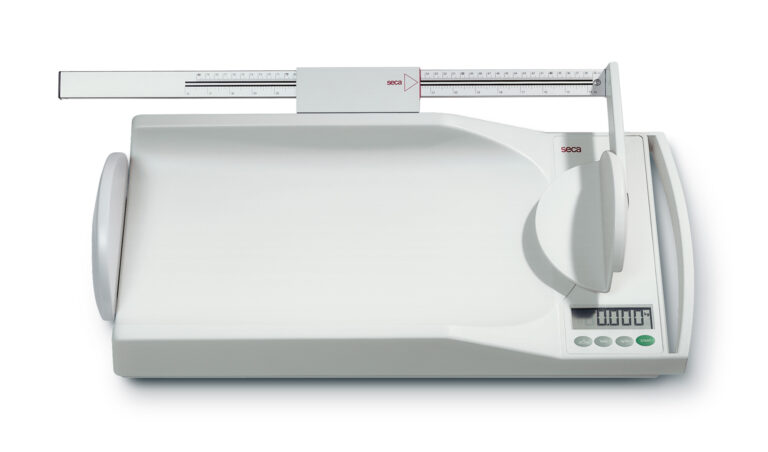 A paediatric scale measures weight, often integrated with the heightometer in one unit.