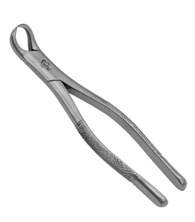 Cowhorn Forceps are specialized dental extraction instruments designed for removing mandibular molars, particularly those with intact bifurcated roots. The name “cowhorn” comes from the distinctive curved beaks of the forceps, which resemble a cow’s horns. These beaks are engineered to grip deeply into the furcation (the space between the roots) and elevate the tooth out of its socket with minimal bone loss.