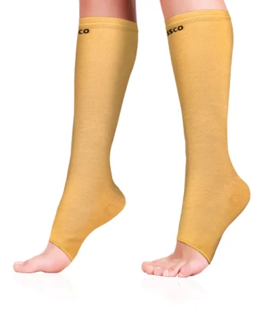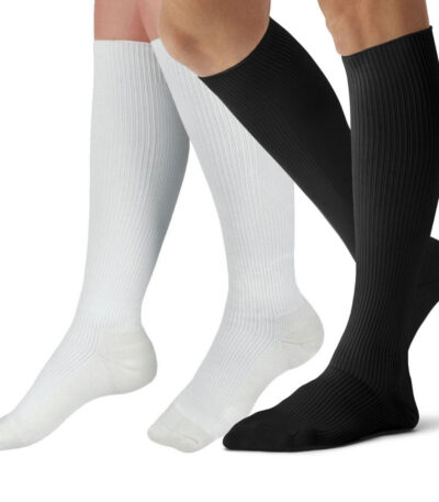 A knee high compression stocking is a snug, elastic sock that fits comfortably from your foot up to just below the knee. Made from breathable, stretchy fabric, it provides gentle, graduated pressure — strongest at the ankle and gradually decreasing toward the knee.