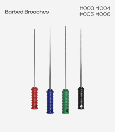 A Barbed Broach is a root canal instrument used in endodontic treatment to remove the dental pulp tissue and other soft debris from the root canal system. It is a thin, flexible, barbed metal file designed for cleaning and debriding the canal during the early stages of root canal therapy.