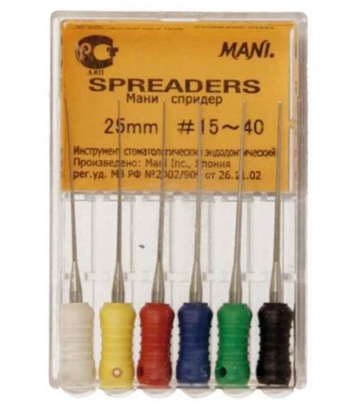 Spreaders are endodontic hand instruments used during root canal therapy to laterally condense gutta-percha or other root filling materials inside the prepared canal. The numbering (15–40) indicates their ISO sizes, corresponding to the diameter of the instrument tip in hundredths of a millimeter.