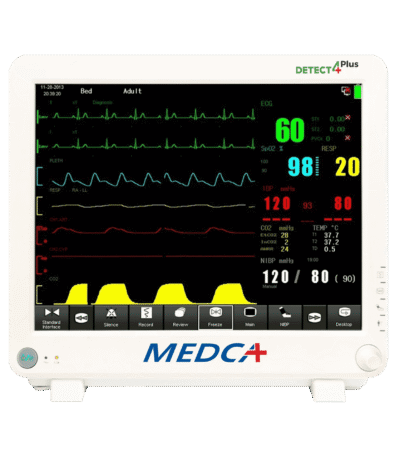 The monitor is designed to display up to seven vital parameters at once, providing complete patient data for diagnosis, anesthesia monitoring, or critical care management. It includes built-in sensors and external probes to measure ECG, heart rate, non-invasive blood pressure, oxygen saturation, respiration rate, temperature, and end-tidal COâ‚‚ (EtCOâ‚‚) or invasive blood pressure depending on the model.