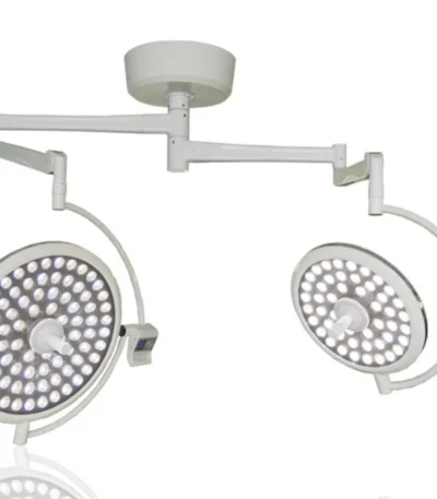 This lighting system features two LED domes (light heads) mounted on independent adjustable arms, allowing surgeons to direct light from different angles. The dual-arm setup ensures uniform, shadowless illumination of the operative field, even when one light is partially obstructed. Each dome contains multiple high-power LED bulbs arranged in a circular configuration for optimal brightness and coverage.