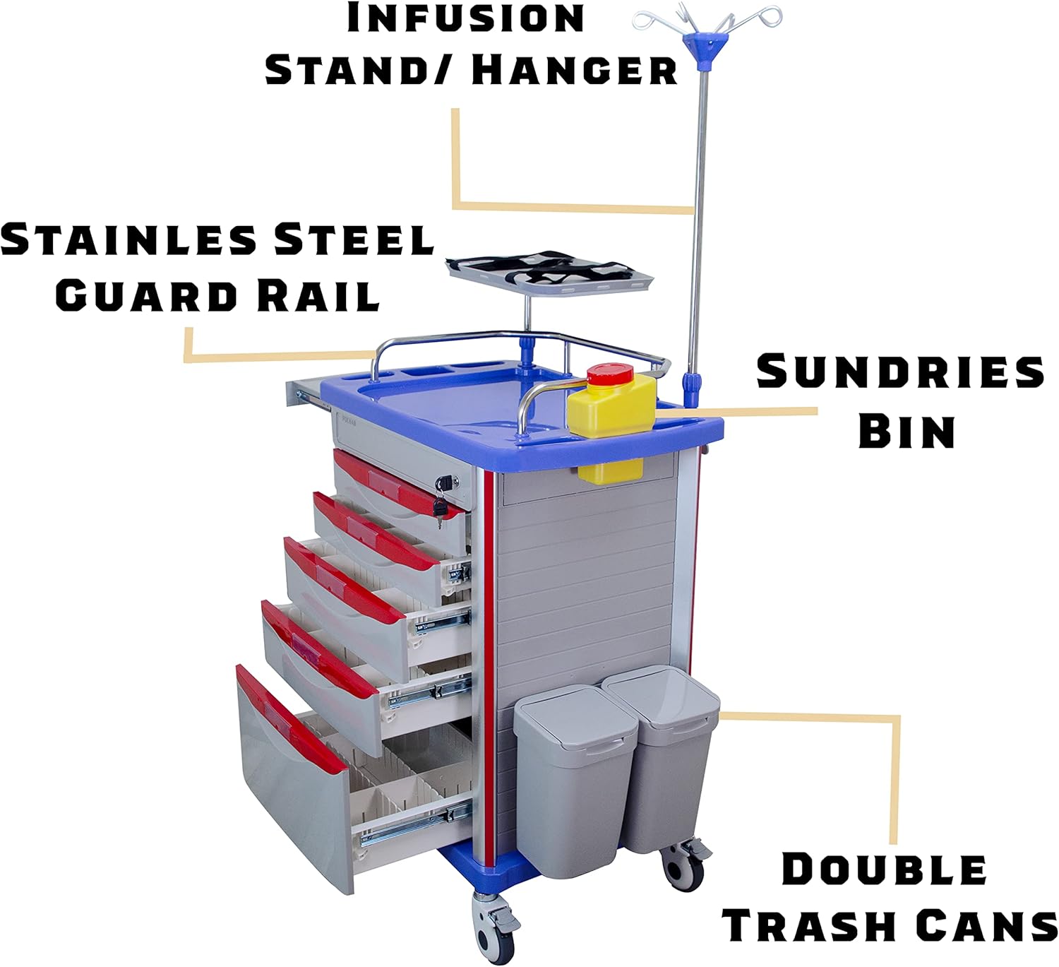 The crash cart is a multi-drawer trolley mounted on castor wheels for easy mobility. It is typically made of stainless steel or powder-coated steel, designed to withstand frequent movement and cleaning. Each drawer is labeled and organized for quick access to emergency items such as airway devices, defibrillator accessories, IV supplies, and emergency medications.
