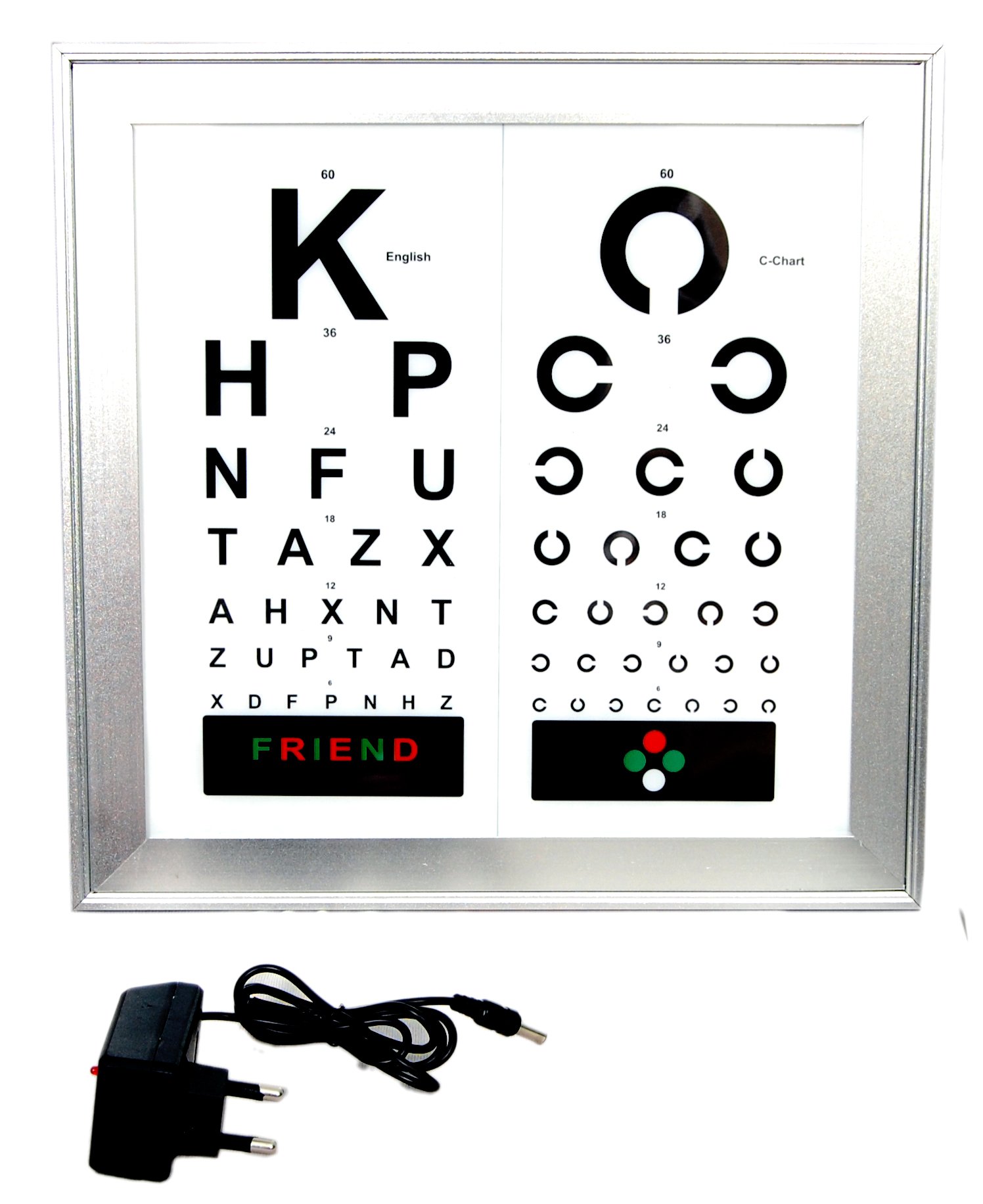 It serves the same purpose as traditional Snellen or LogMAR charts but uses LED backlighting or digital LED display panels for brighter, clearer, and more consistent illumination.