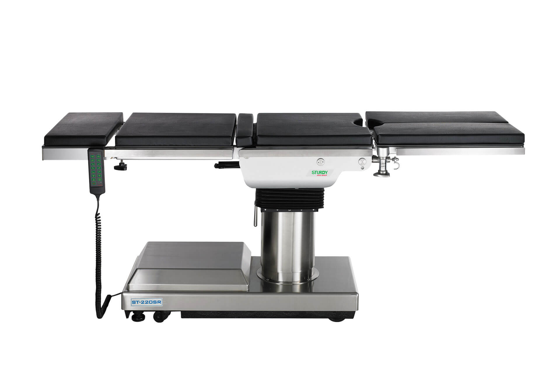 The Hydraulic Operating Table consists of a sturdy stainless-steel base, a sectioned tabletop, and a hydraulic lifting mechanism controlled by a foot pedal. The tabletop is divided into several adjustable sections (head, back, seat, leg, and kidney bridge) to accommodate different surgical positions.