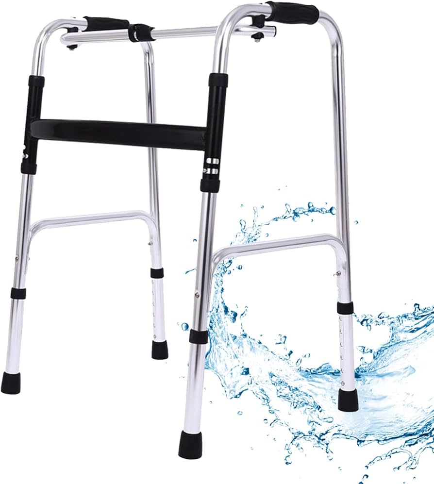 Walking frame with folding aluminum frame. Light weight and height adjustable. Ergonomic PVC handles.